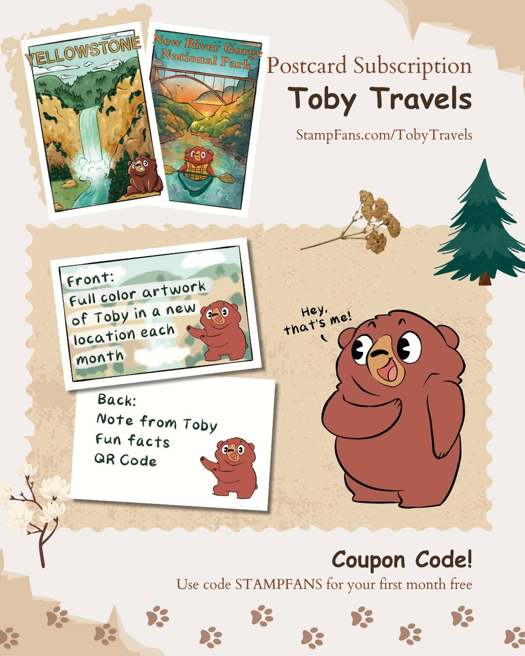 Or, if you want the full subscription, go to StampFans.com/TobyTravels to sign up and get a postcard from Toby in your mailbox every month. Use code STAMPFANS for your first month free!