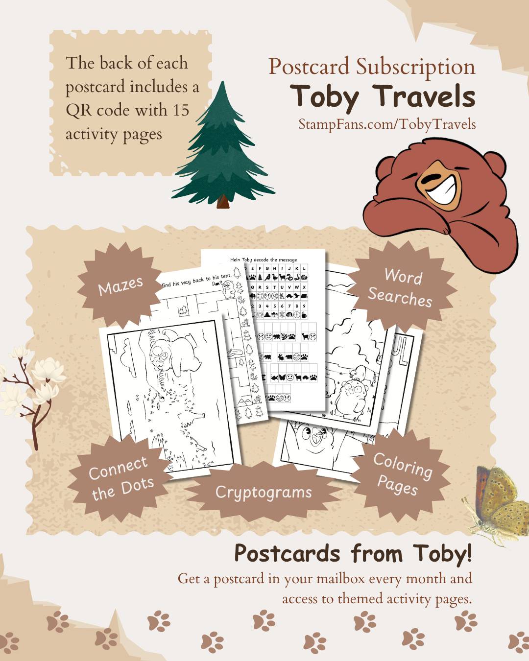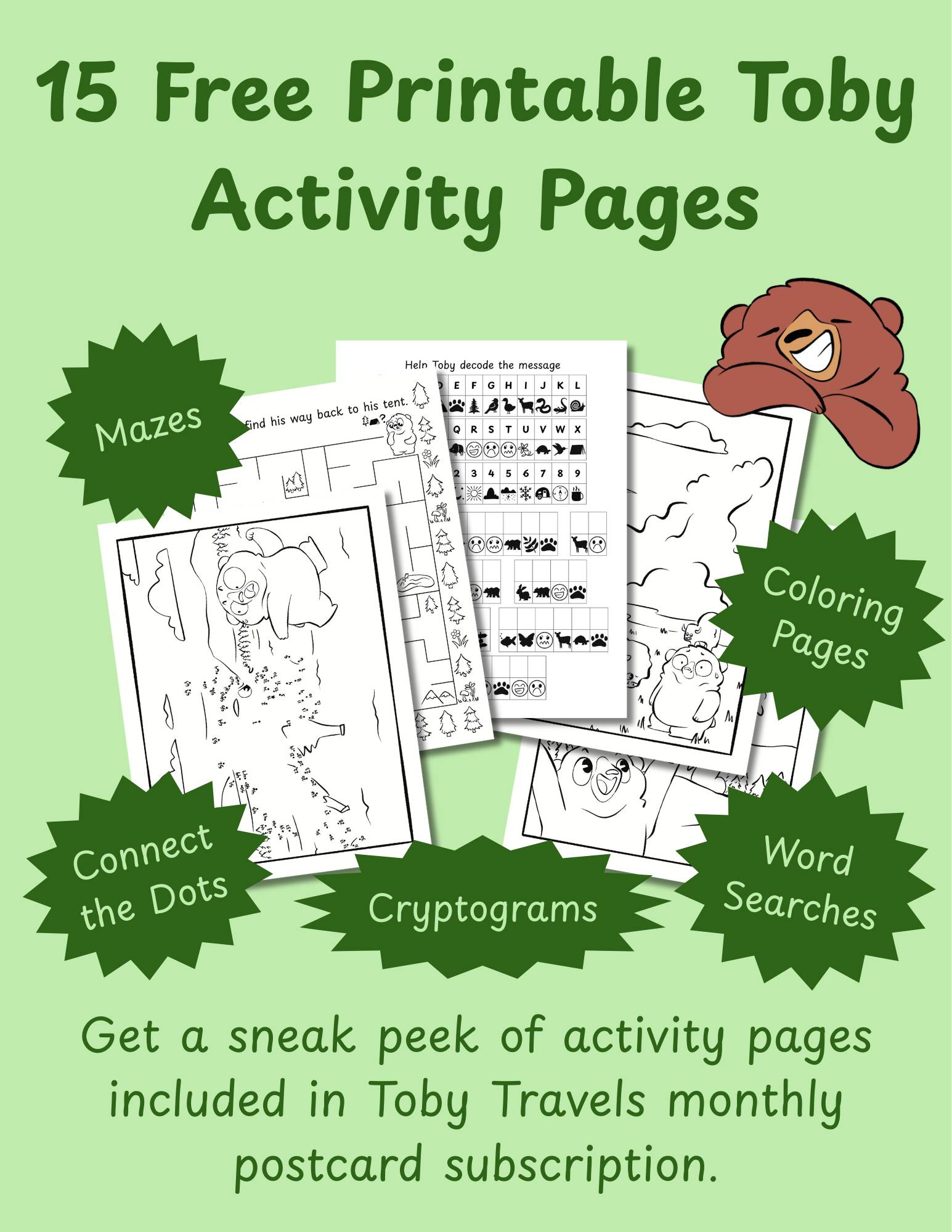 Toby shares his travels and fun facts through activity pages that include a variety of mazes, connect the dots, cryptograms, word searches, coloring pages, seek-and-finds, or spot the differences. Enter your email above to get 15 free printable activity pages of Toby's adventures.